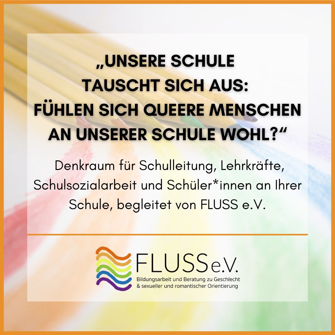 „Unsere Schule tauscht sich aus: Wie queersensibel sind wir wirklich? Fühlen sich queere Menschen an unserer Schule wohl?“ – FLUSS e.V. begleitet an Ihrer Schule einen Denkraum für Schulleitung, Lehrkräfte, Schulsozialarbeit und Schüler*innen